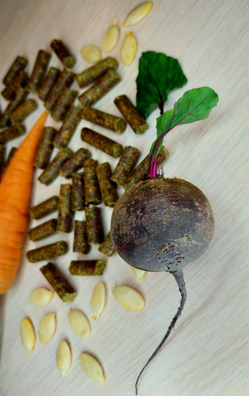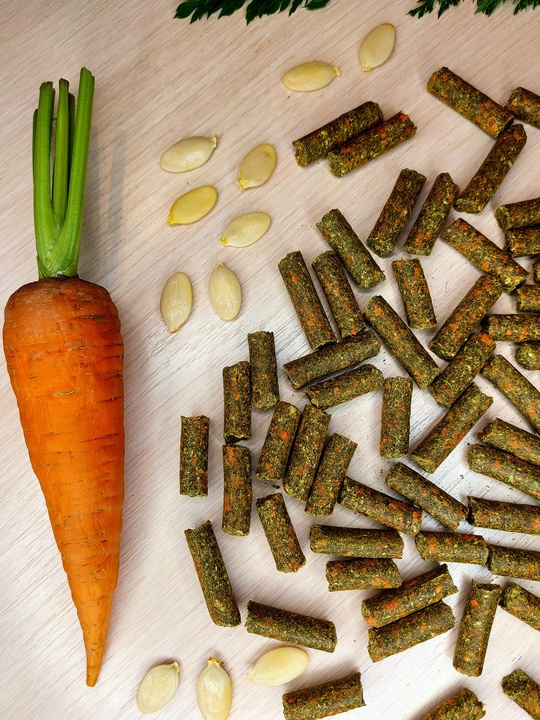 Состав: тыквенный жмых, хлопья льна, втм луговое разнотравье, сушеная морковь.